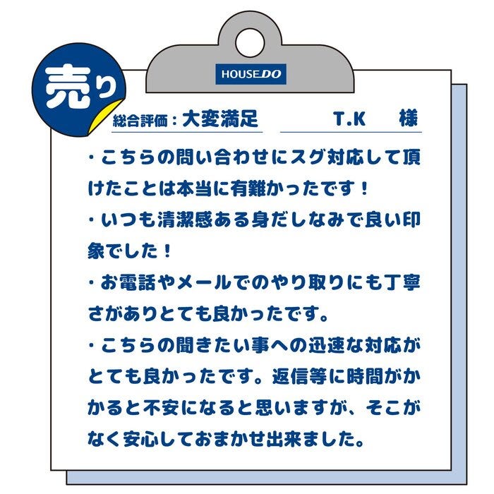 ・こちらの聞きたい事への迅速な対応がとても良かったです。返信等に時間がかかると不安になると思いますが、そこがなく安心しておまかせ出来ました。